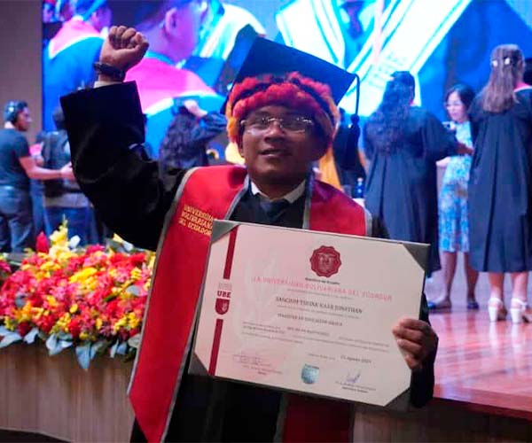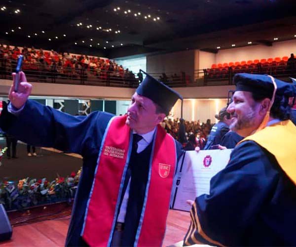 Uno de los momentos más emotivos del evento fue la interpretación musical del estudiante Andrés Solís Checa, quien dedicó la canción “Color esperanza” a sus compañeros, como un mensaje de motivación y unión. El acto concluyó con la intervención del rector de la universidad, Ph.D. Roberto Tolozano Benites, quien brindó junto a los nuevos titulados en un cierre simbólico que culminó con el tradicional lanzamiento de birretes.