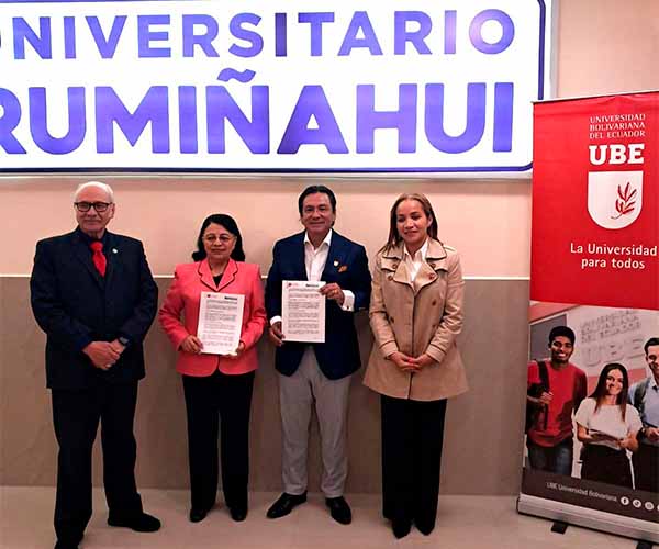 La Universidad Bolivariana del Ecuador (UBE) suscribió un acuerdo de cooperación interinstitucional con el Instituto Superior Universitario Rumiñahui, con el objetivo de generar nuevas oportunidades académicas para profesionales, tecnólogos y jóvenes ecuatorianos, especialmente de la provincia de Pichincha.
