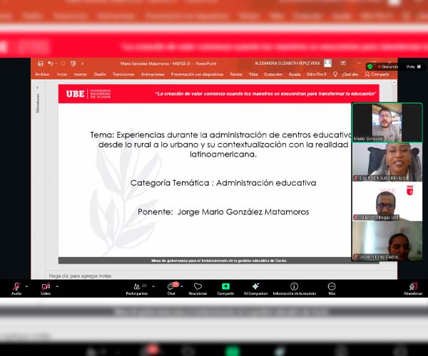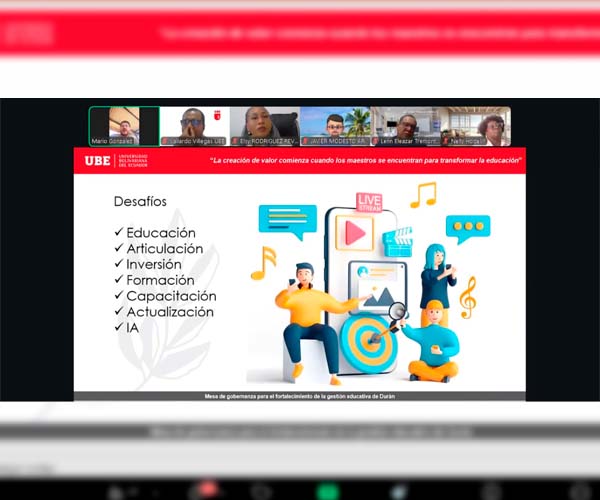 Con esta jornada virtual, la UBE reafirma su compromiso con la promoción del diálogo pedagógico, la socialización del conocimiento y la construcción de propuestas educativas pertinentes, fortaleciendo el desarrollo profesional docente y consolidando el impacto del Primer Encuentro de Maestras y Maestros de Durán como un hito en las actividades de la Mesa de Gobernanza.
