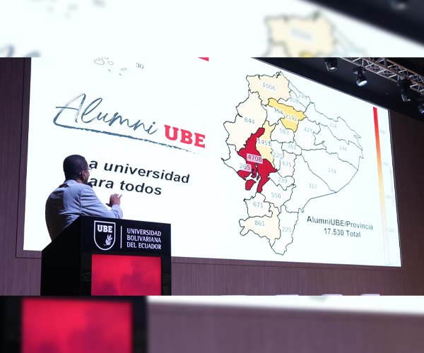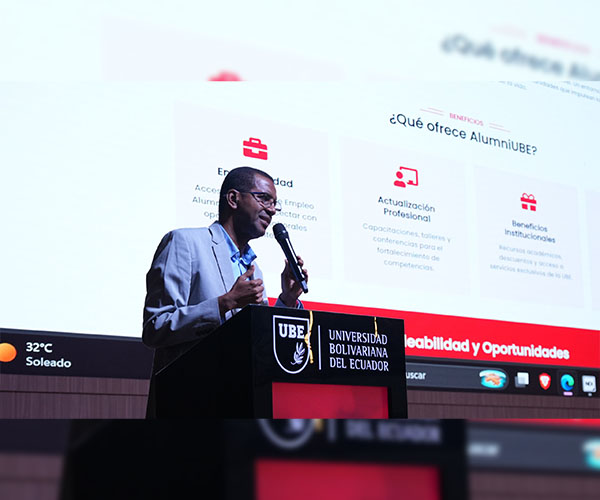 Durante el evento, el MSc. Vallardo Villegas presentó el Ecosistema AlumniUBE, destacando los beneficios y servicios disponibles para la comunidad de graduados. De igual manera, el MSc. Gonzalo Pizarro expuso sobre el valor de las microcredenciales como herramienta clave para la actualización profesional, mientras que la MSc. Gabriela Tolozano Lapierre dio a conocer la oferta académica de formación permanente dirigida a los egresados.