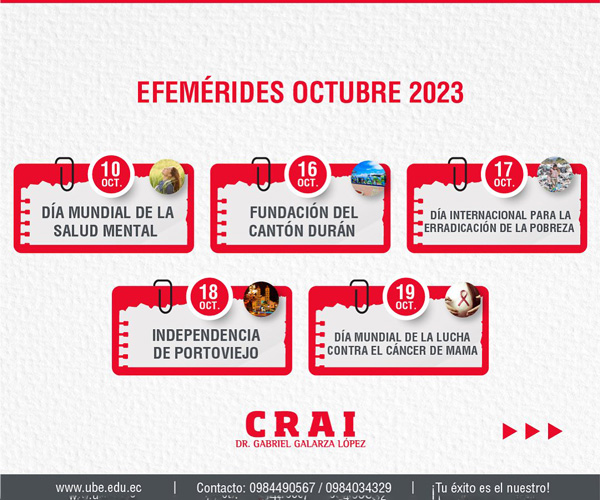 ¡Inició octubre y estas son las efemérides que el CRAI te invita a conocer! La música  la Odontología  los docentes el Cáncer de mama y algunas ciudades del Ecuador ???????? conmemoran nuevos aniversarios de acontecimientos notables en la historia.  ¿Cuál es tu efeméride favorita? ¡Cuéntanos en los comentarios!