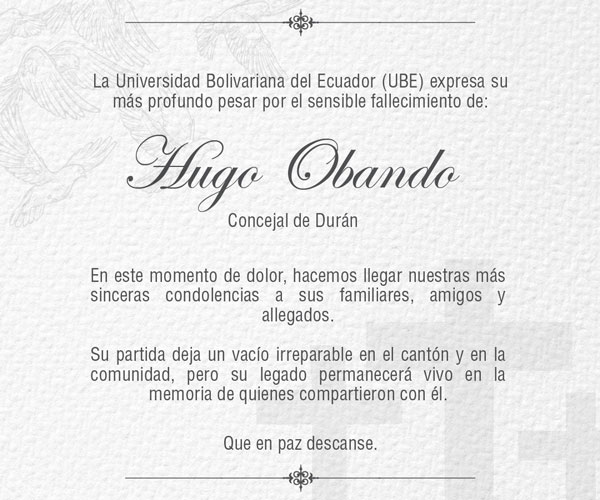 Leer másLa UBE lamenta con profundo pesar el fallecimiento de Hugo Obando, concejal de Durán.